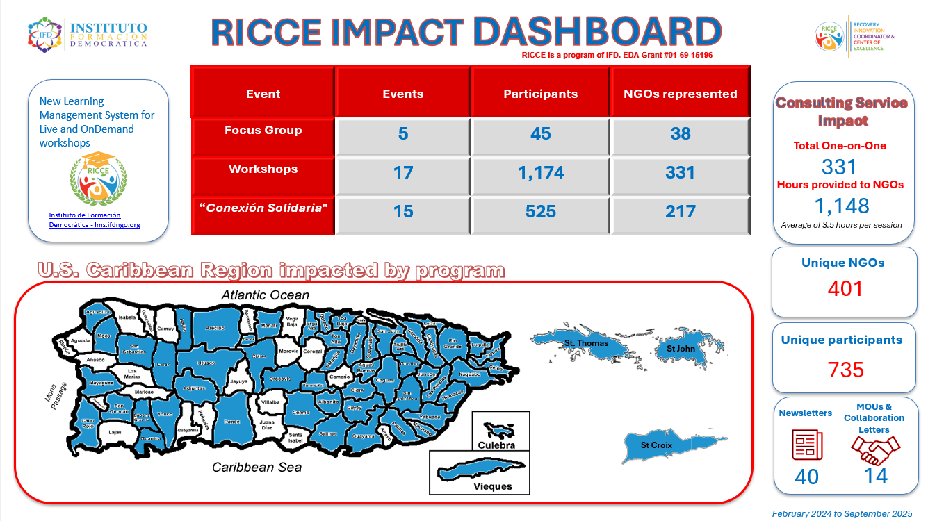 The RICCE is a program established by a grant from the Economic Development Administration (EDA), under the Institute for Democratic Training (IFD). Its main objective is to strengthen Third Sector Organizations in Puerto Rico and the Virgin Islands, enabling them to establish solid organizational structures that allow them to directly access federal funds. This program provides specialized training and mentorship, promoting innovation, collaboration, and efficiency in their operations for a positive and lasting impact on their communities.