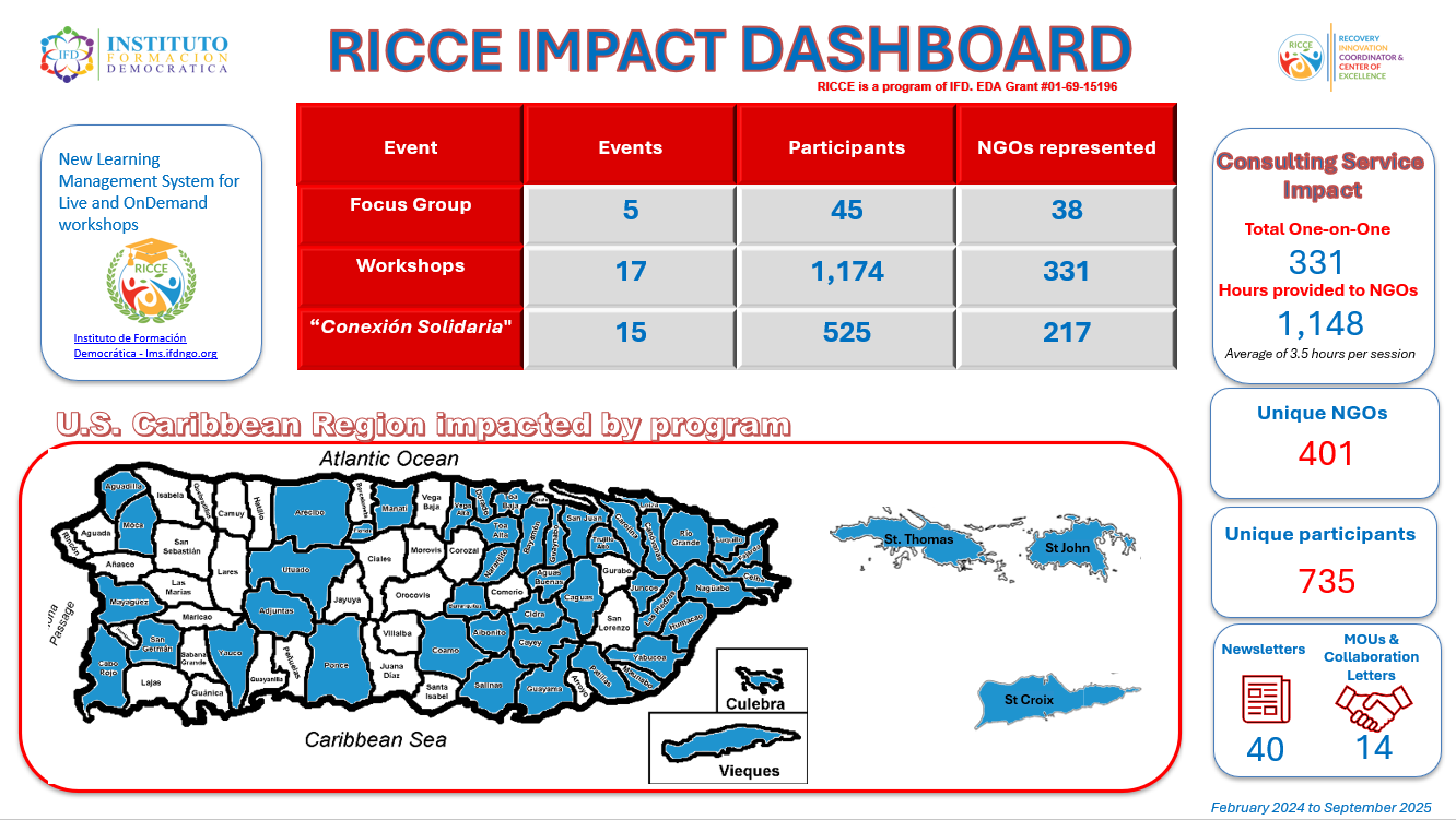 RICCE es un programa establecido por una subvención de la Administración de Desarrollo Económico (EDA), bajo el Instituto para la Formación Democrática (IFD). Su principal objetivo es fortalecer a las Organizaciones del Tercer Sector en Puerto Rico y las Islas Vírgenes, permitiéndoles establecer estructuras organizativas sólidas que les permitan acceder directamente a fondos federales. Este programa proporciona formación especializada y mentoría, promoviendo la innovación, la colaboración y la eficiencia en sus operaciones para un impacto positivo y duradero en sus comunidades.