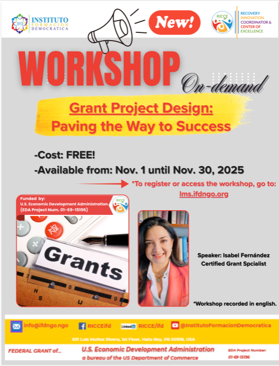 The RICCE is a program established by a grant from the Economic Development Administration (EDA), under the Institute for Democratic Training (IFD). Its main objective is to strengthen Third Sector Organizations in Puerto Rico and the Virgin Islands, enabling them to establish solid organizational structures that allow them to directly access federal funds. This program provides specialized training and mentorship, promoting innovation, collaboration, and efficiency in their operations for a positive and lasting impact on their communities.
